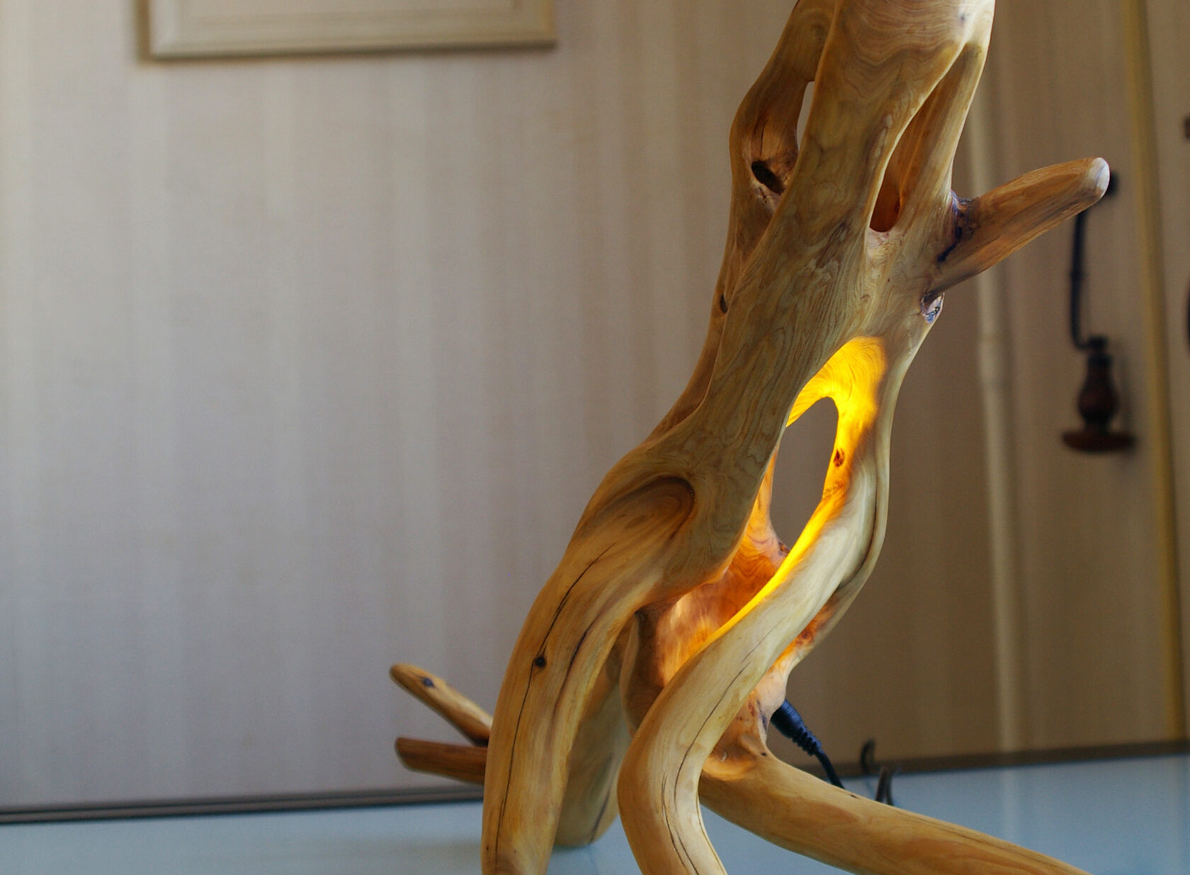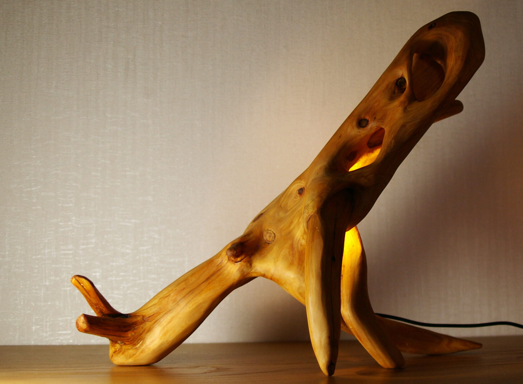 Грибы в этом светильнике светятся независимо от времени года. А так же выполнен светильник полностью из можжевельника. Этот тонкий и нежный аромат древесины создает теплую атмосферу в доме.